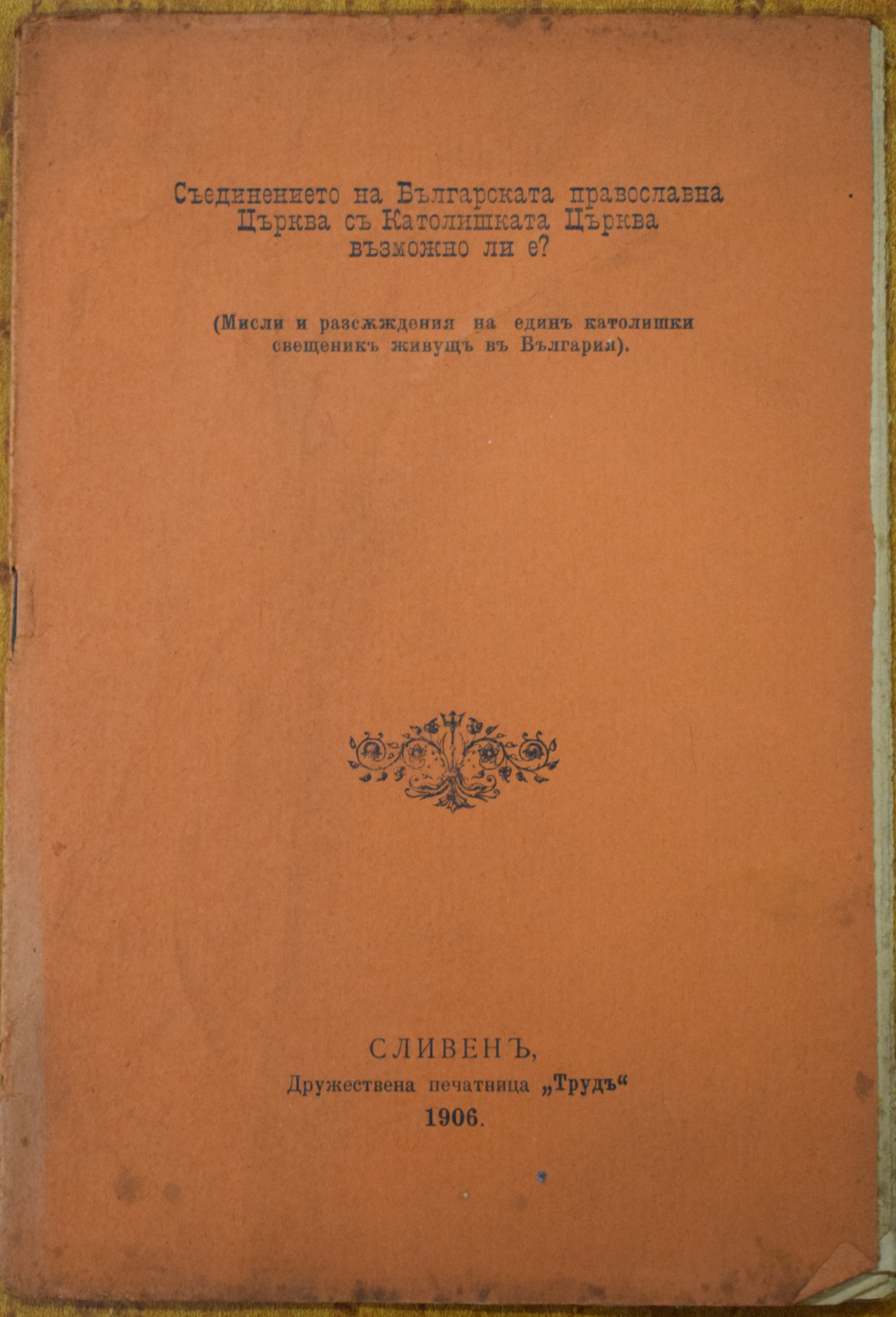 Съединението на българската православна църква с католишката църква възможно ли е? : Мисли и разсъждения на един католишки свещеник живущ в България / анонимен. - Сливен : Дружествена печатница "Труд", 1906. - 20; 26 см, 4°