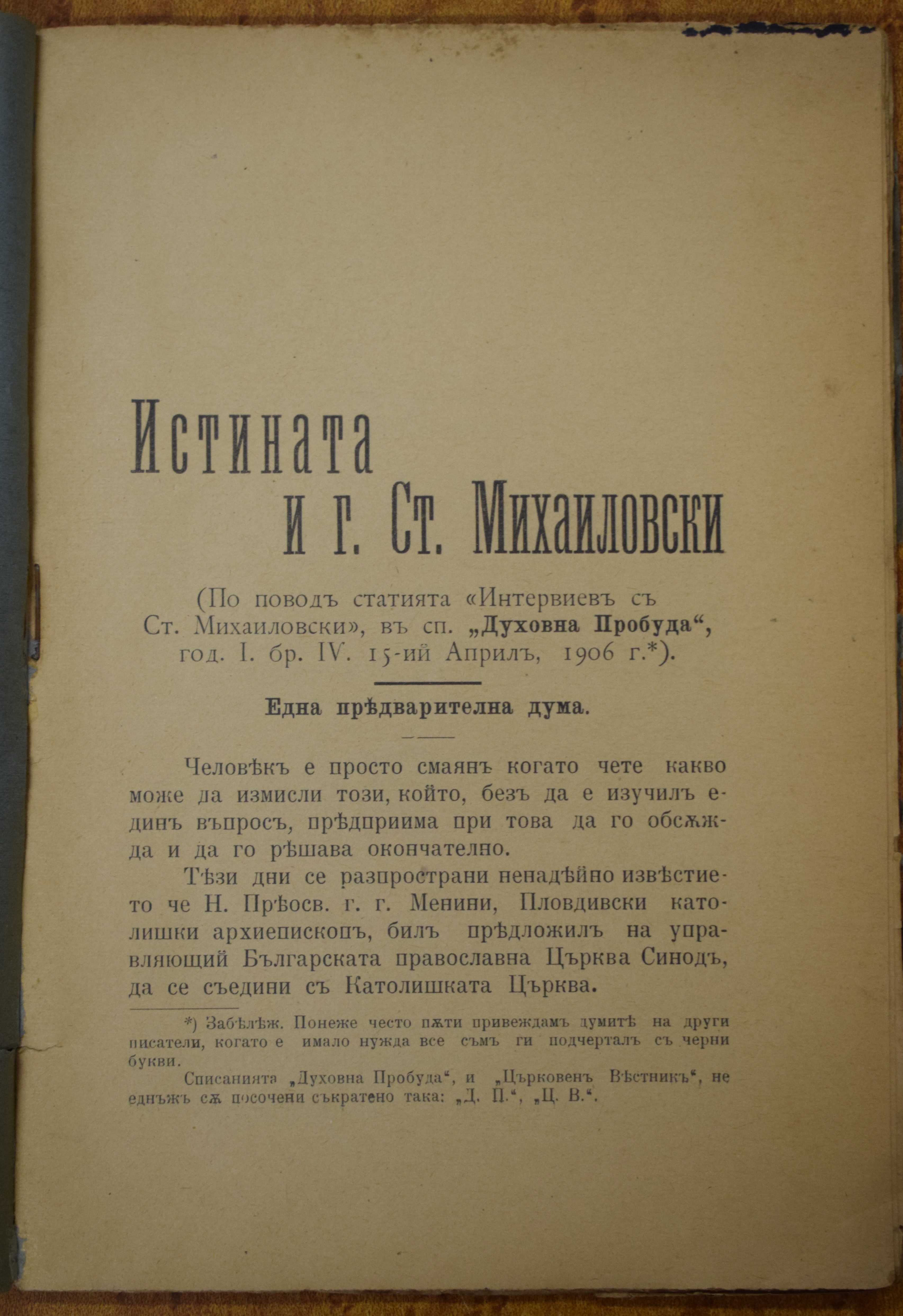 Истината и г. Ст. Михайловски : По повод статията Интервиев [интервю] със Ст. Михайловски в сп. Духовна пробуда, год. I, бр. 4, 15 апр. 1906