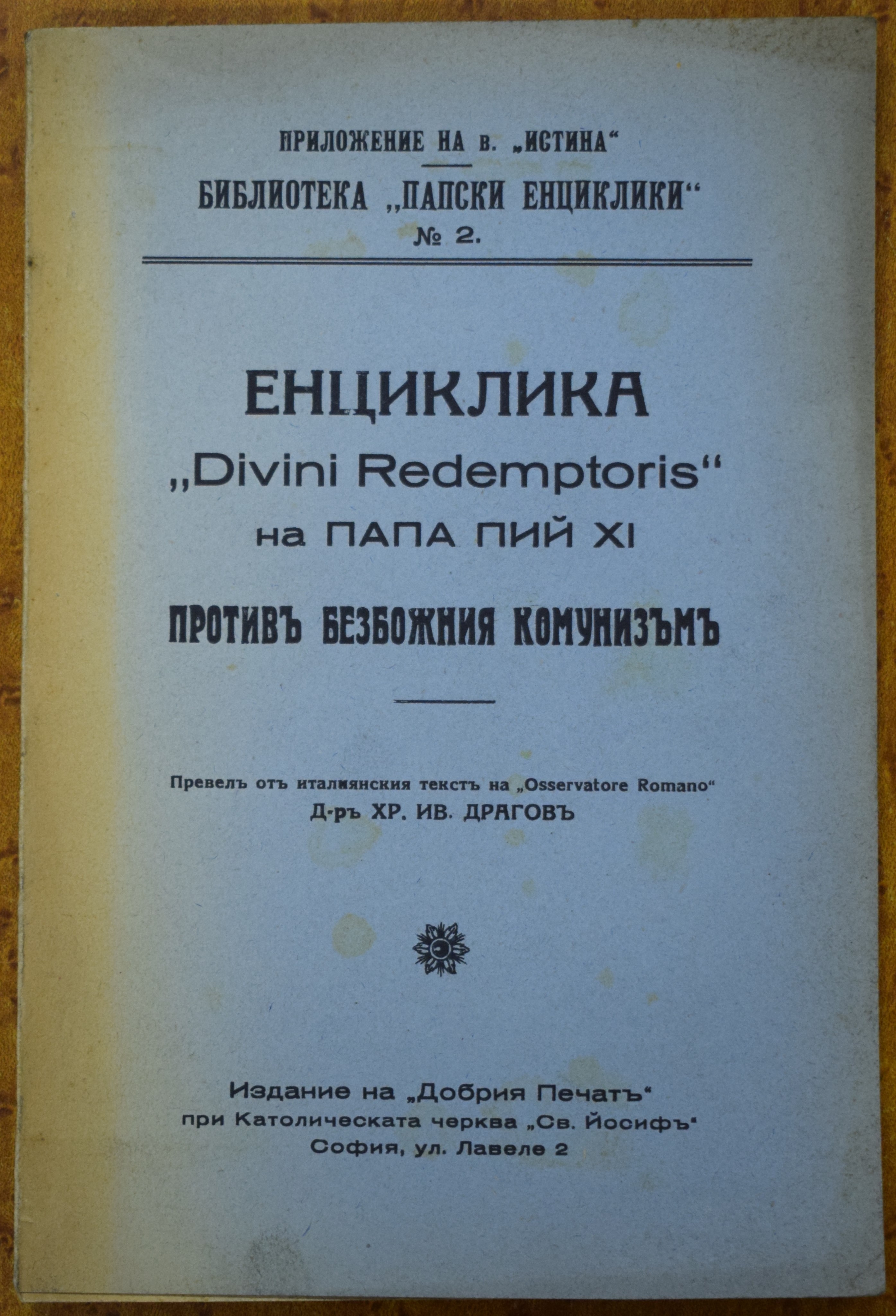 Енциклика = Divini Redemptoris : Против безбожния комунизъм / папа Пий XI, превел от италиански д-р Хр. Ив. Драгов. - София : Издание на "Добрия Печат", [1937]. - 36, (4); 25 см, 8°. - (Библиотека "Папски енциклики" ; 2).