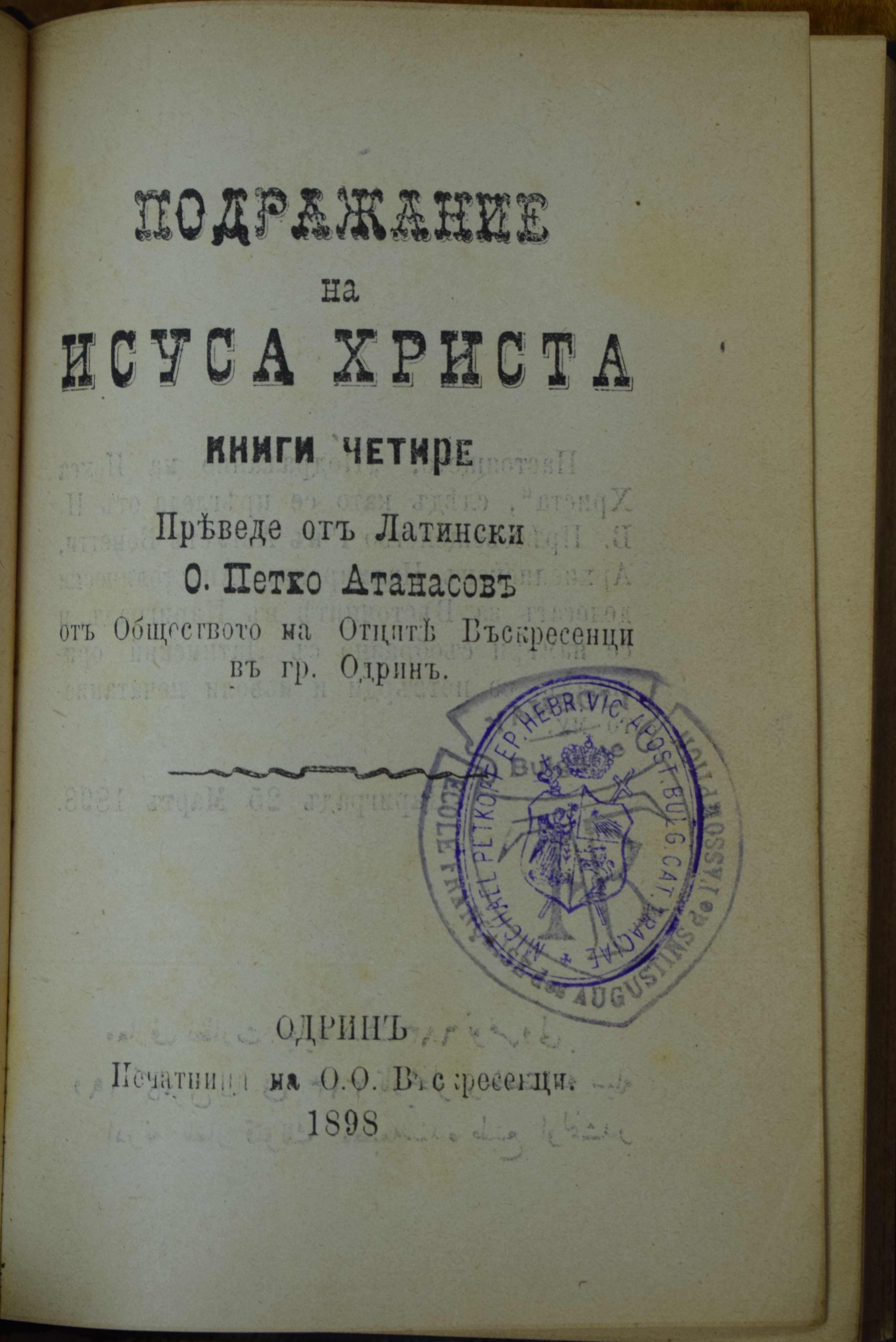 Подражание на Исуса Христа : Книга четири / Тома Кемпийски, преведе от латински О. Петко Атанасов от Обществото на Отците Възкресенци в гр. Одрин. - Одрин, 1898 (Печатница на О.О. Възкресенци). - [4], 360, XII; 19 см, 8°