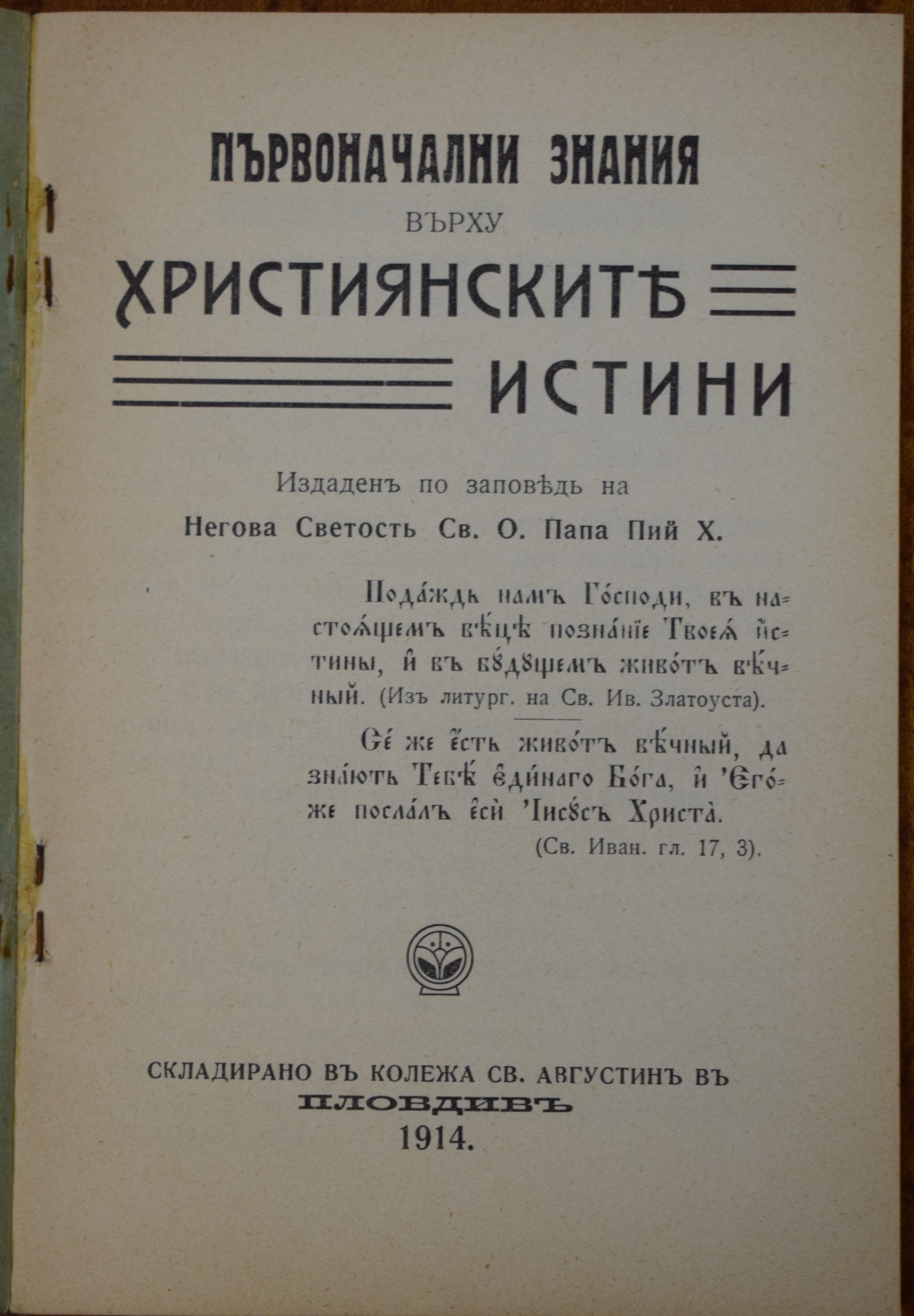 Първоначални знания върху християнските истини. - Пловдив, 1914 (Складирано в колежа св. Августин). - 96: с ил., портр.; 16 см, 8°