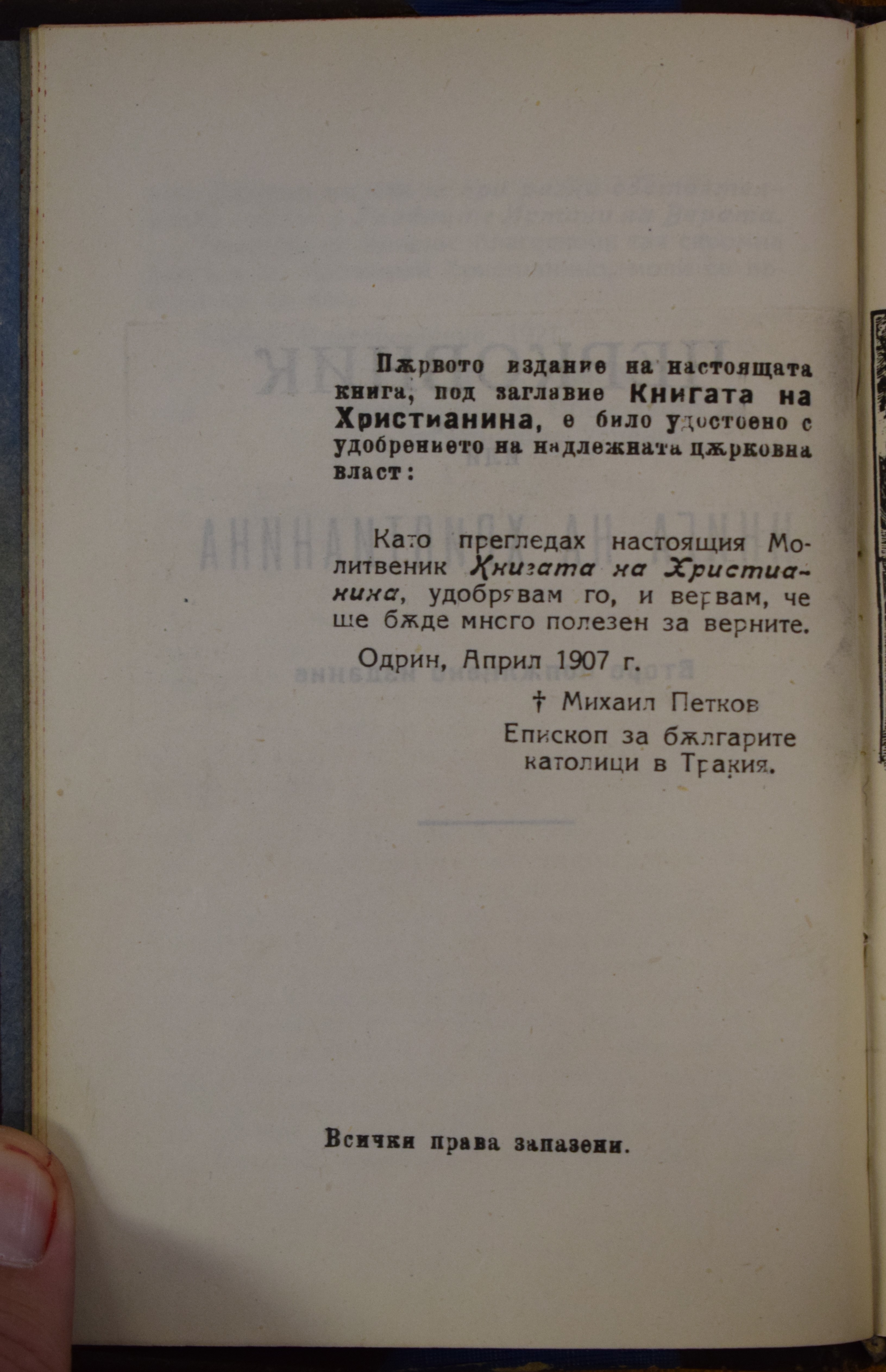 | 500 $ а | Първо издание 1907 г. Трето издание - 1935 г. Имприматура: Първото издание на настоящата книга, под заглавие Книгата на християнина, е било удостоено с одобрението на надлежната църковна власт: Като прегледах настоящия Молитвеник Книгата на християнина, одобрявам го и вярвам, че ще бъде много полезен за верните. Одрин, април 1907 Михаил Петков, Епископ на българите католици в Тракия. На гърба на подвързията: намира се за продан при Католическата църква - Ямбол. Цена: неподвързана 10 лв., с мека подвързия 15 лв. Розова мека издателска подвързия. |