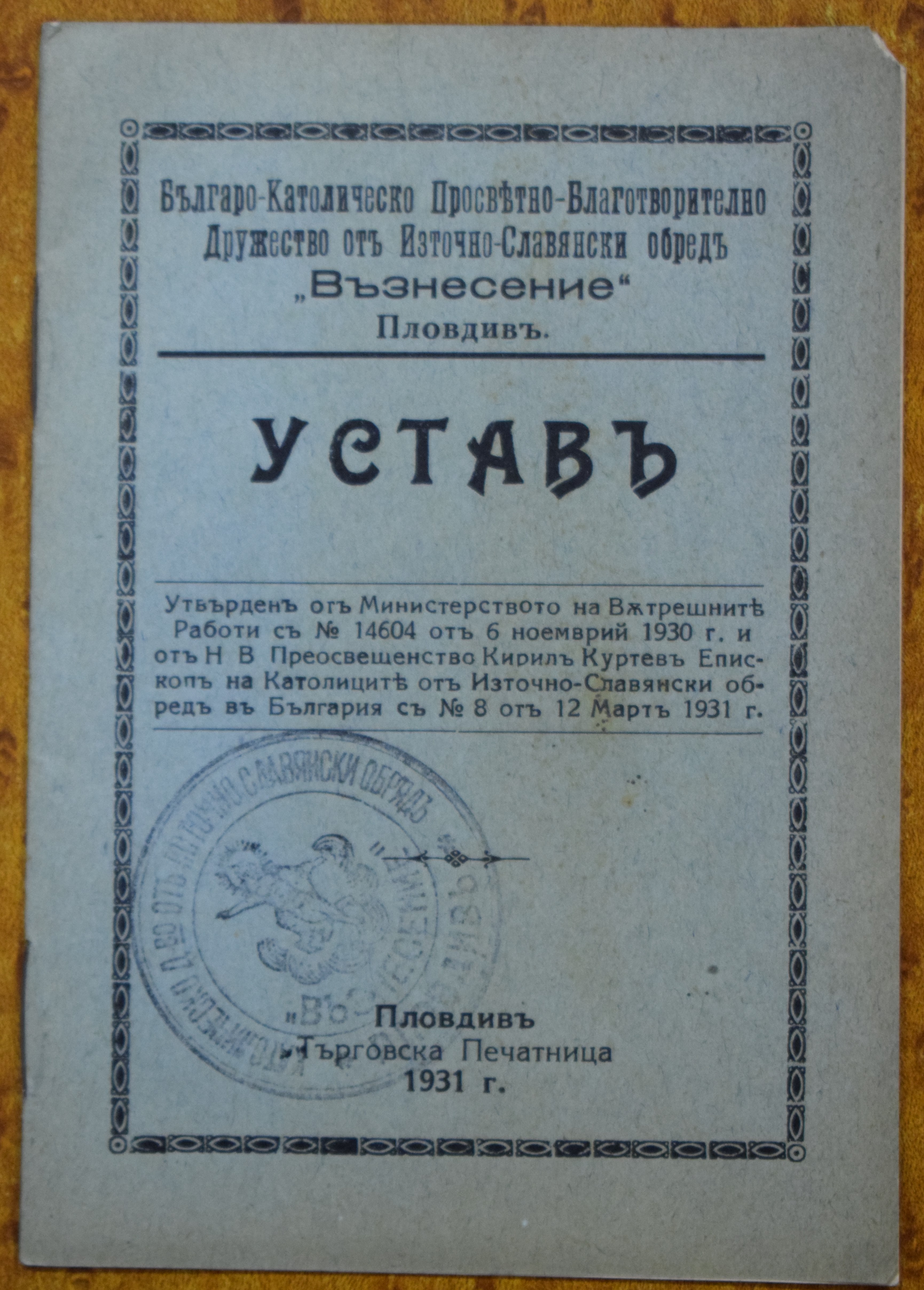 Устав на българо-католическото просветно благотворително дружество отъ източно славянски обред „Възнесение" в гр. Пловдив