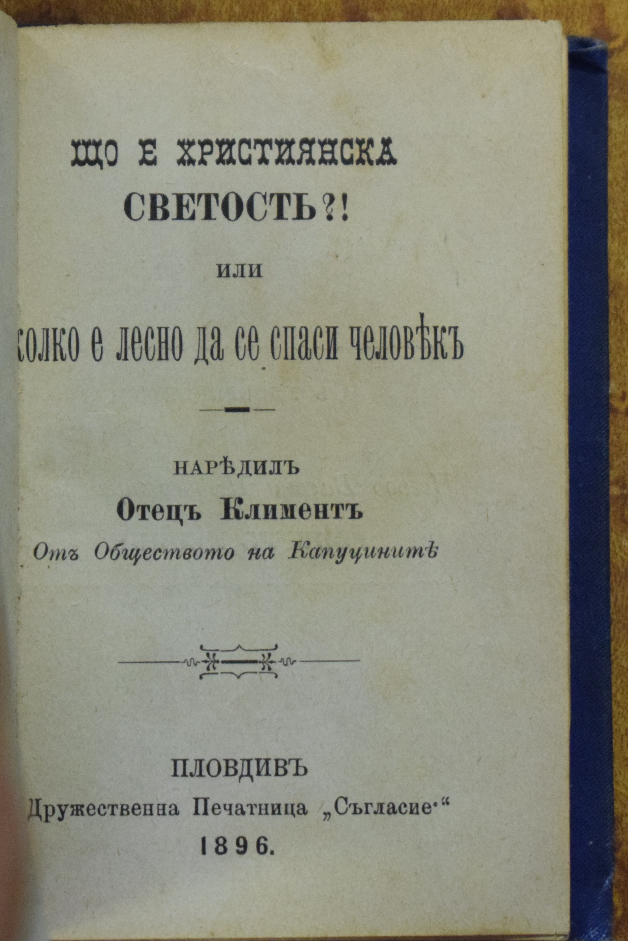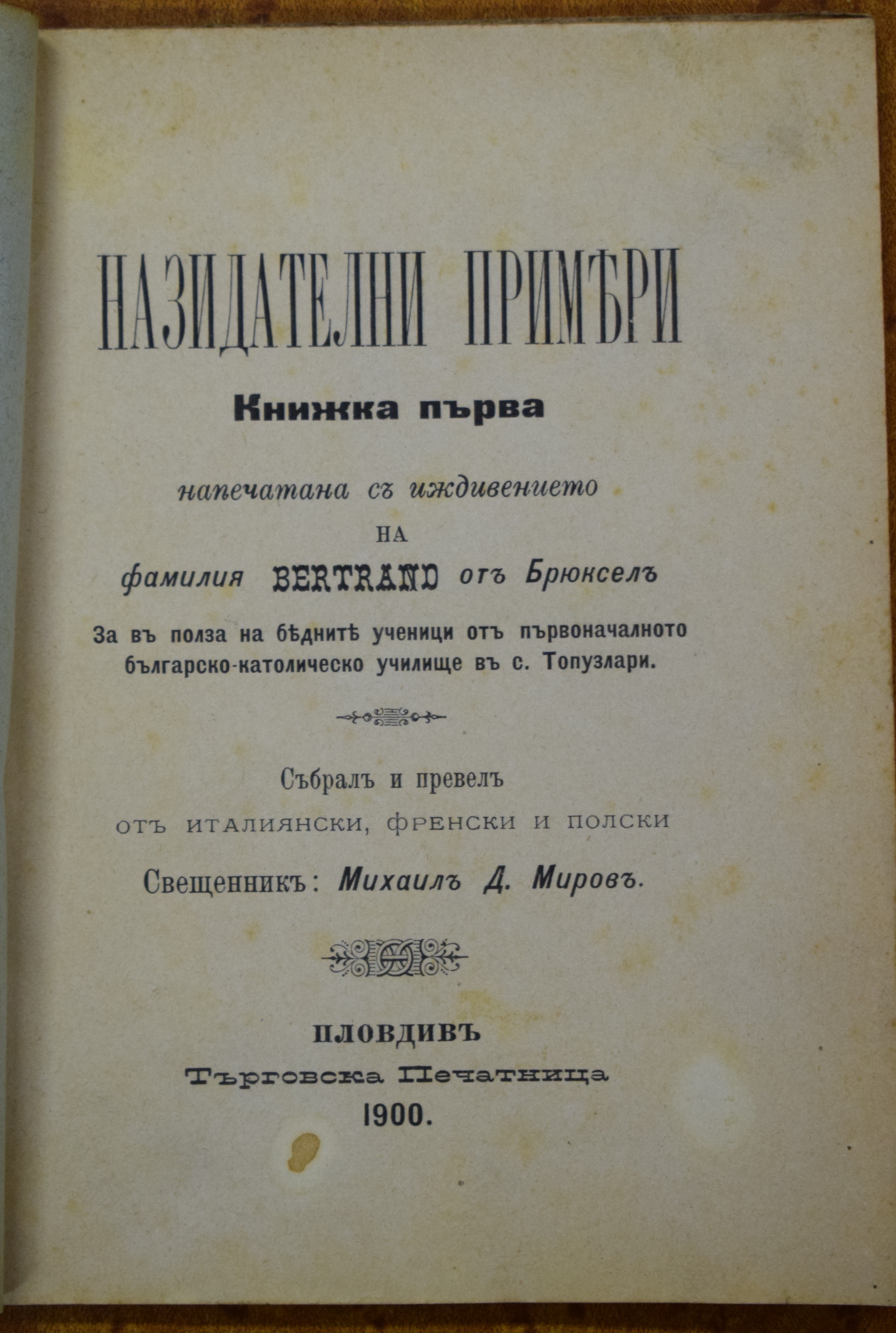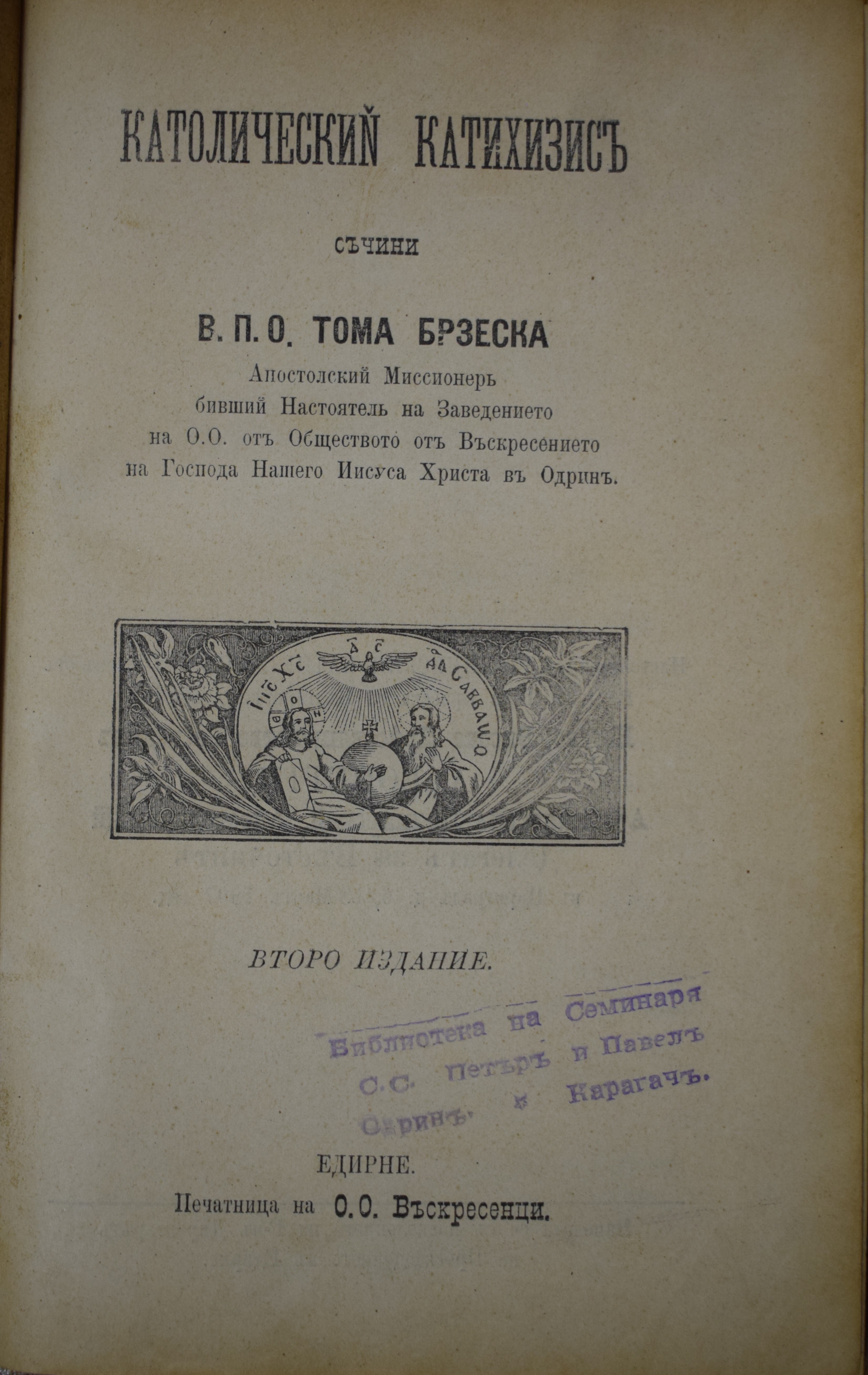 Превел и наредил отец Йосиф Начов, капуцин; Напечатал с иждивението на Н. В. Благоговейнство Отец Бернард от Андермат, Главен настоятел на капуцините
